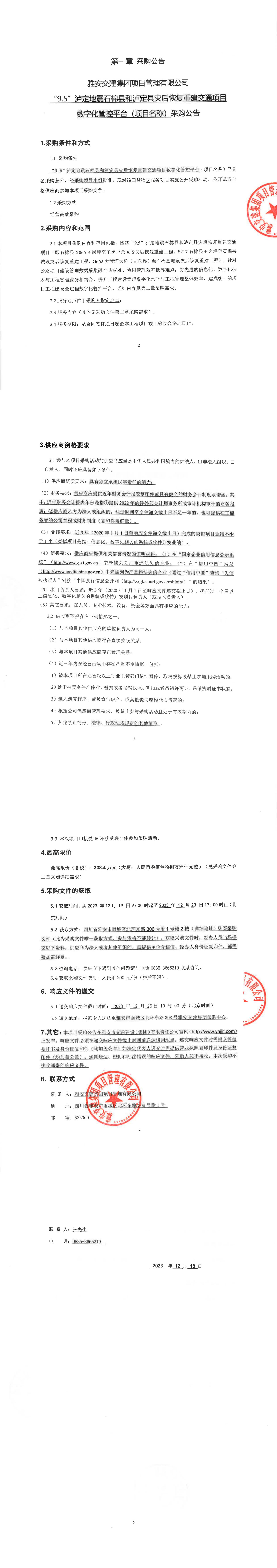 雅安交建集團項目管理有限公司“9.5”瀘定地震石棉縣和瀘定縣災(zāi)后恢復(fù)重建交通項目數(shù)字化管控平臺(項目名稱)采購公告