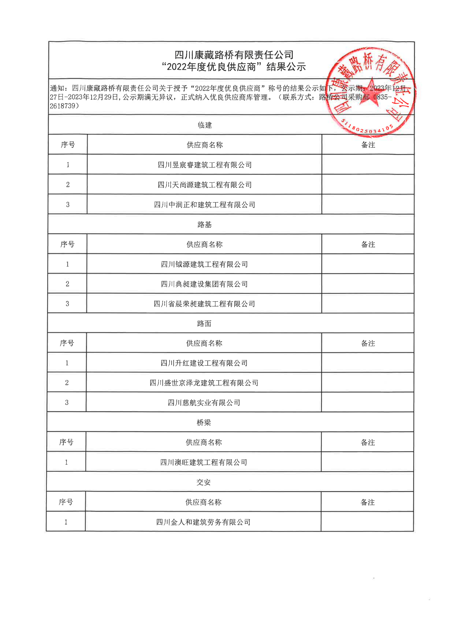 四川康藏路橋有限責任公司“2022年度優(yōu)良供應(yīng)商”結(jié)果公示
