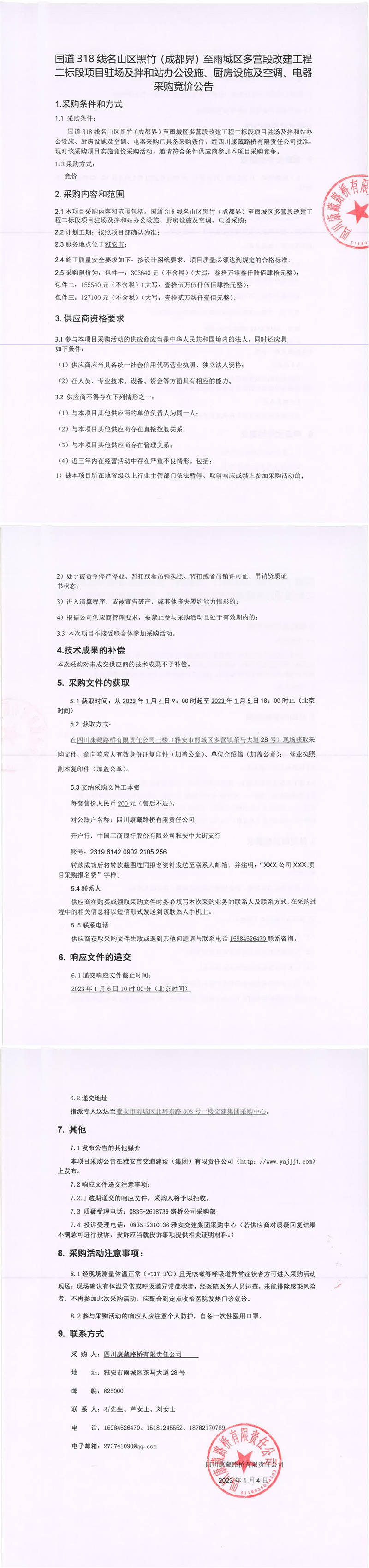 四川康藏路橋有限責(zé)任公司國道318線名山區(qū)黑竹(成都界)至雨城區(qū)多營段改建工程二標(biāo)段項(xiàng)目駐場及拌和站辦公設(shè)施、廚房設(shè)施及空調(diào)、電器采購競價公告