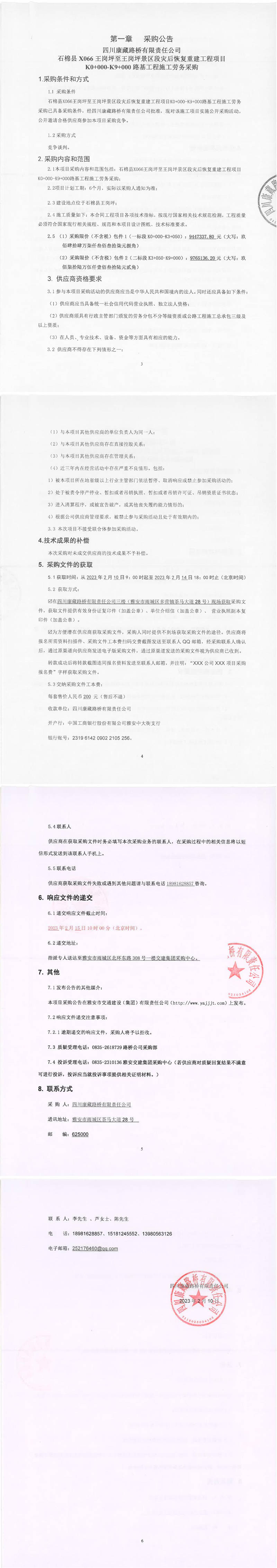 四川康藏路橋有限責(zé)任公司石棉縣X066王崗坪至王崗坪景區(qū)段災(zāi)后恢復(fù)重建工程項(xiàng)目K0+000-K9+000路基工程施工勞務(wù)采購(gòu)采購(gòu)公告