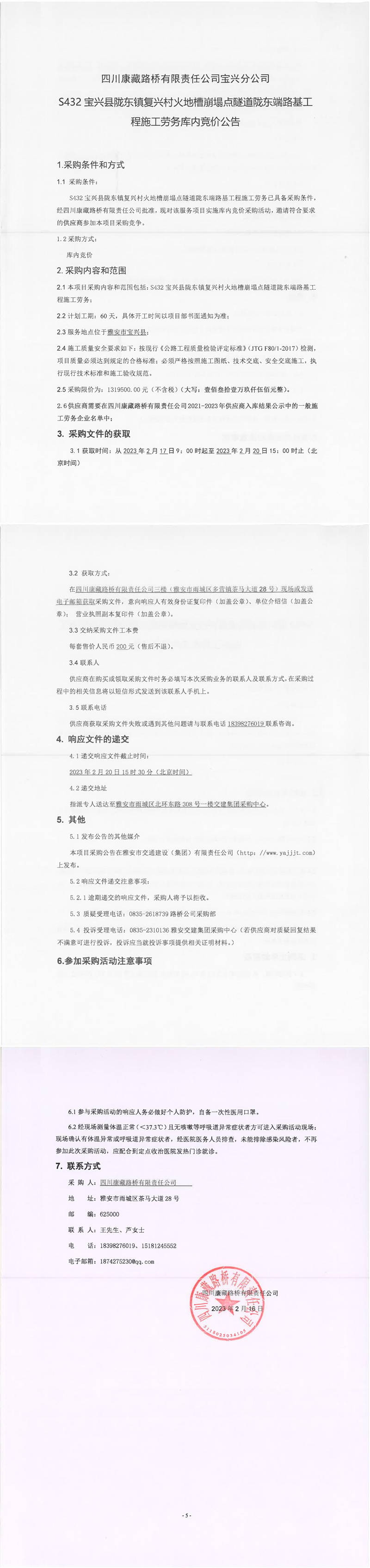 四川康藏路橋有限責任公司S432寶興縣隴東鎮(zhèn)復興村火地槽崩塌點隧道隴東端路基工程施工勞務(wù)庫內(nèi)競價公告