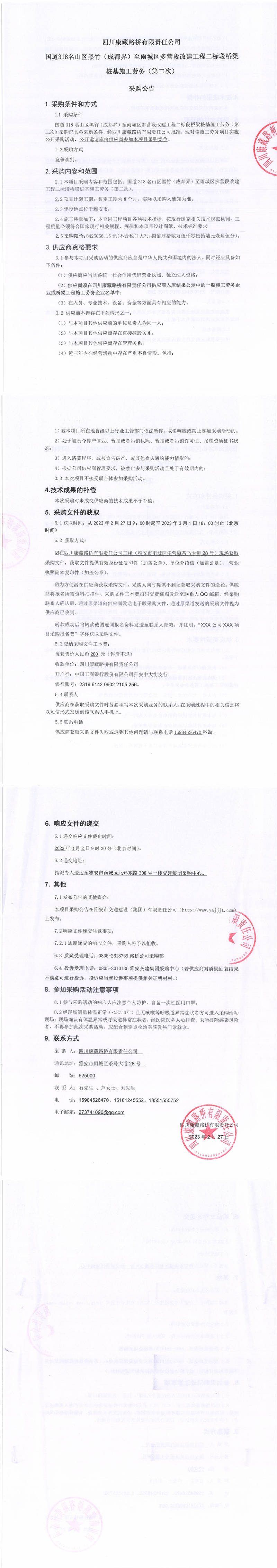 四川康藏路橋有限責任公司國道318名山區(qū)黑竹(成都界)至雨城區(qū)多營段改建工程二標段橋梁樁基施工勞務(第二次)采購公告