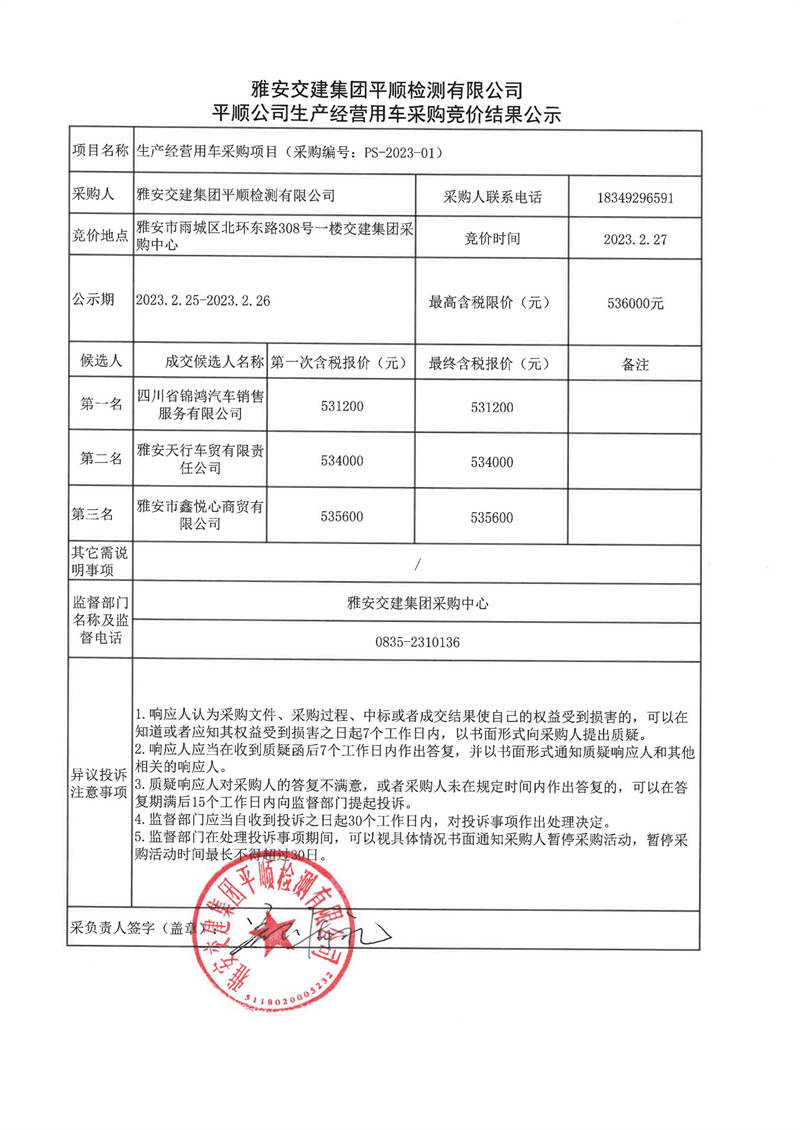 雅安交建集團(tuán)平順檢測(cè)有限公司平順公司生產(chǎn)經(jīng)營(yíng)用車(chē)采購(gòu)競(jìng)價(jià)結(jié)果公示