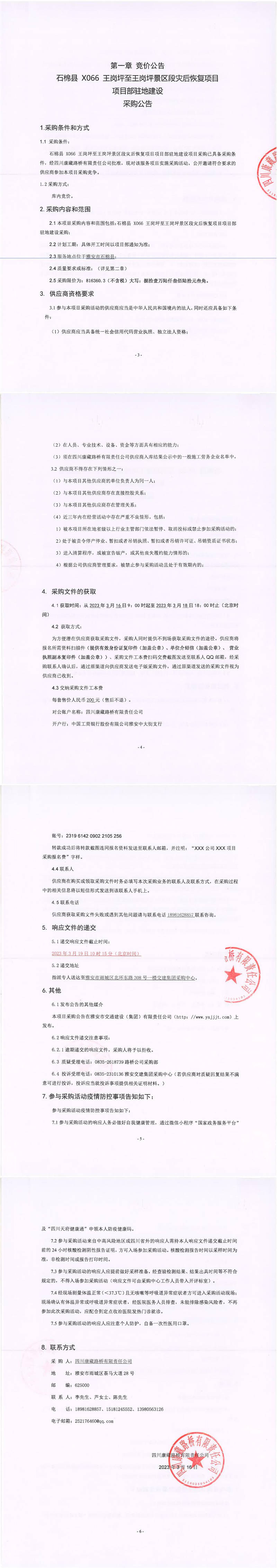 四川康藏路橋有限責(zé)任公司石棉縣X066王崗坪至王崗坪景區(qū)災(zāi)后恢復(fù)項(xiàng)目項(xiàng)目部駐地建設(shè)采購(gòu)公告