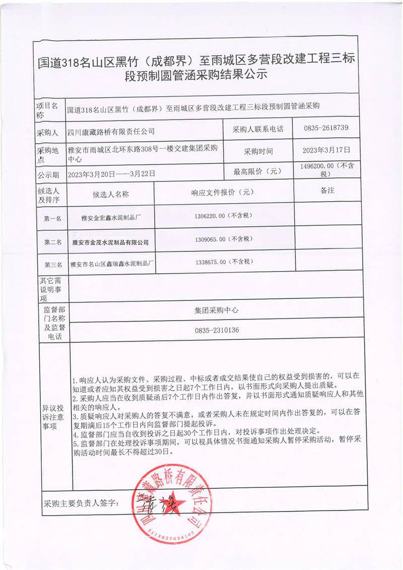 四川康藏路橋有限責任公司國道318名山區(qū)黑竹(成都界)至雨城區(qū)多營段改建工程三標段預制圓管涵采購結果公示