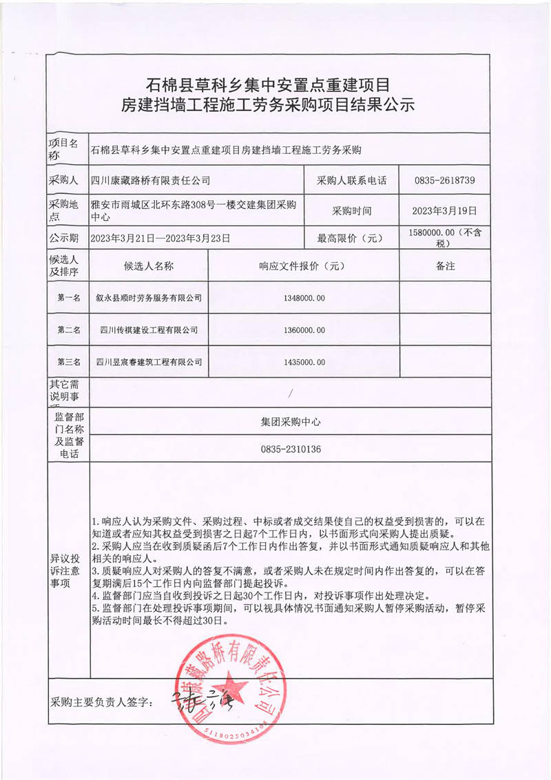 四川康藏路橋有限責(zé)任公司石棉縣草科鄉(xiāng)集中安置點(diǎn)重建項目房建擋墻工程施工勞務(wù)采購項目結(jié)果公示