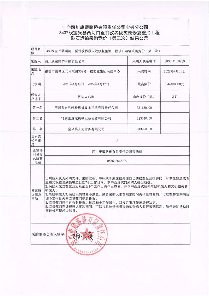 四川康藏路橋有限責任公司寶興分公司S432線寶興縣兩河口至甘孜界段災毀修復整治工程砂石運輸采購競價(第三次)結果公示