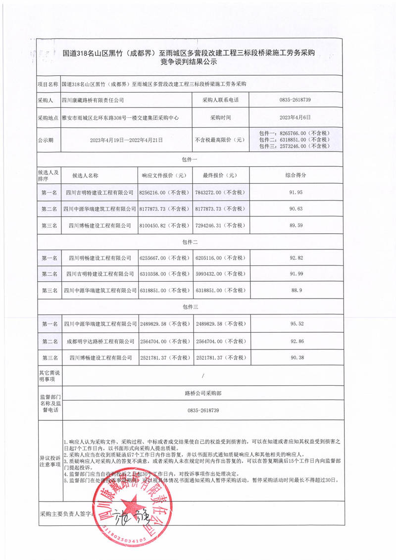 四川康藏路橋有限責任公司國道318名山區(qū)黑竹(成都界)至雨城區(qū)多營段改建工程三標段橋梁施工勞務(wù)采購競爭談判結(jié)果公示