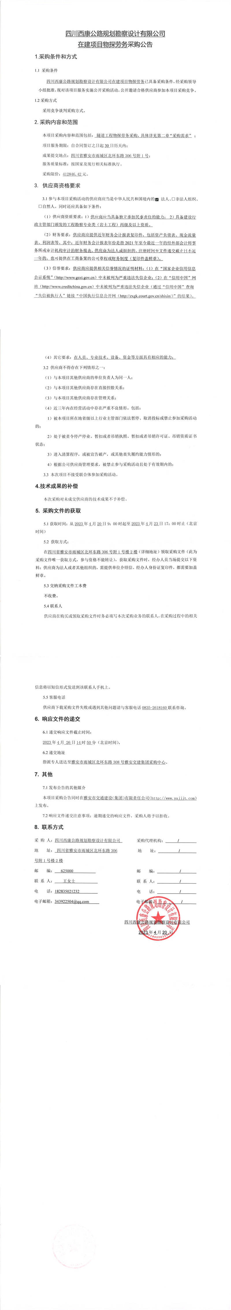四川西康公路規(guī)劃勘察設計有限公司在建項目物探勞務采購公告