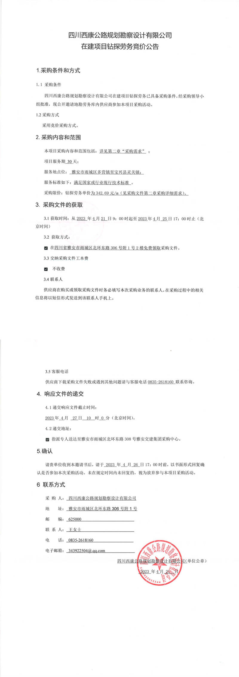 四川西康公路規(guī)劃勘察設(shè)計(jì)公司在建項(xiàng)目鉆探勞務(wù)競(jìng)價(jià)公告