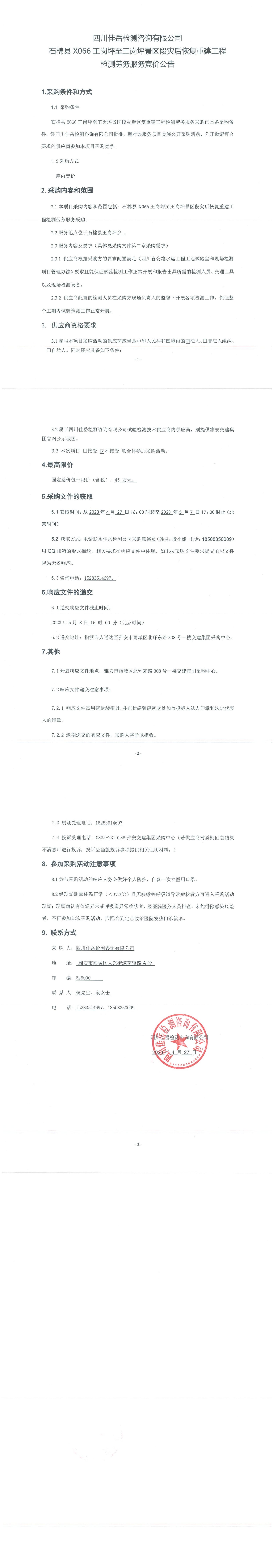 四川佳岳檢測咨詢有限公司石棉縣X066王崗坪至王崗坪景區(qū)段災(zāi)后恢復重建工程檢測勞務(wù)服務(wù)競價公告