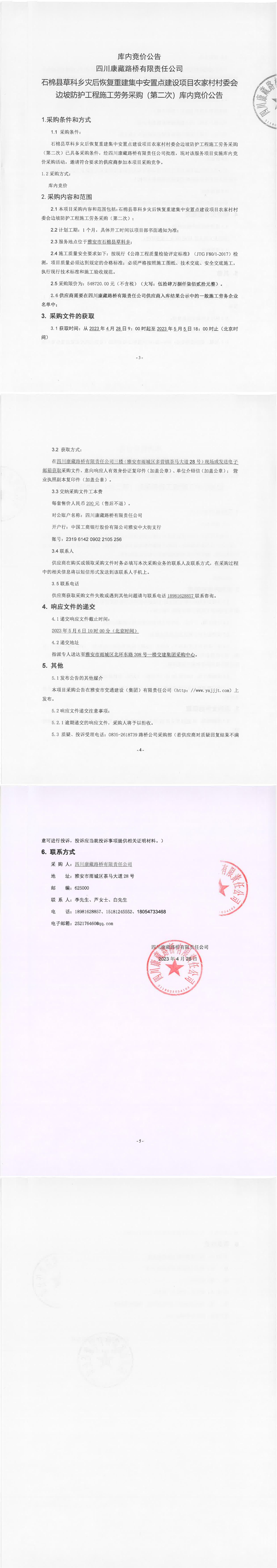 四川康藏路橋有限責(zé)任公司石棉草科鄉(xiāng)災(zāi)后恢復(fù)重建集中安置點(diǎn)建設(shè)項(xiàng)目農(nóng)家村村委會(huì)邊坡防護(hù)工程施工勞務(wù)采購(gòu)(第二次)庫(kù)內(nèi)競(jìng)價(jià)公告