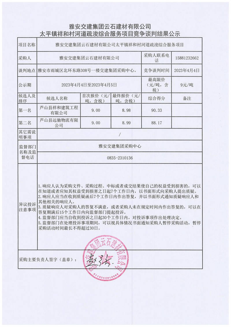 雅安交建集團(tuán)云石建材有限公司太平鎮(zhèn)祥和村河道疏浚綜合服務(wù)項目競爭談判結(jié)果公示