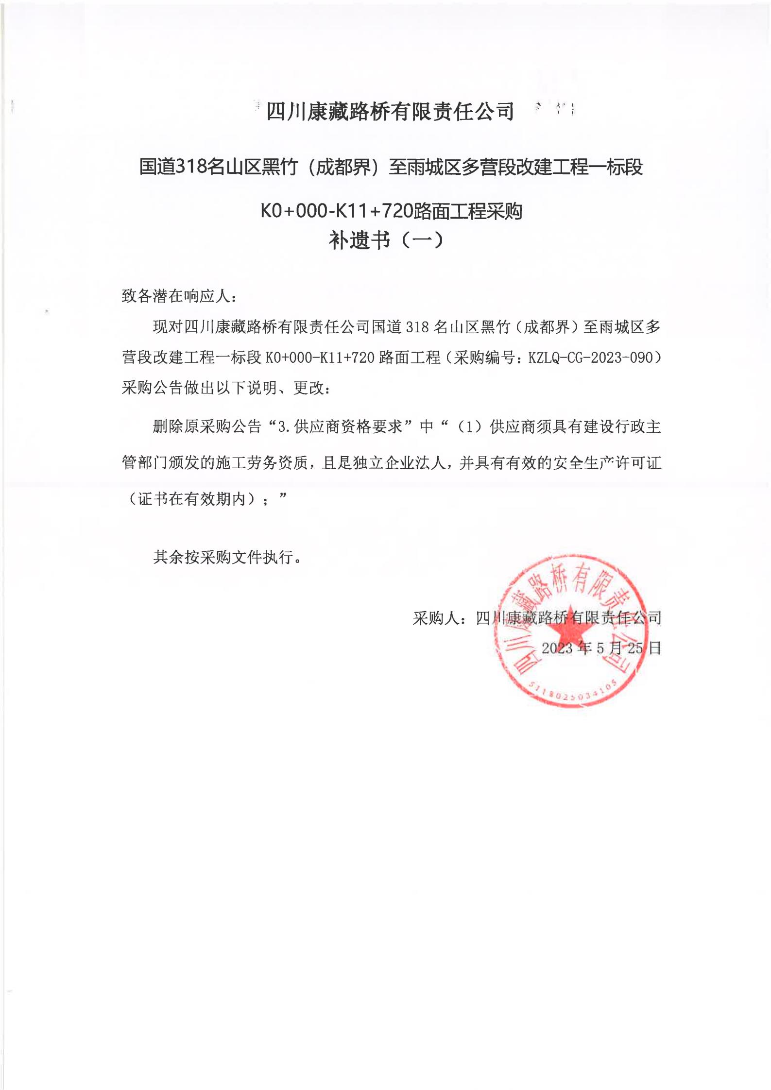 四川康藏路橋有限責(zé)任公司國道318名山區(qū)黑竹(成都界)至雨城區(qū)多營(yíng)段改建工程一標(biāo)段K0+000-K11+720路面工程采購補(bǔ)遺書(一)