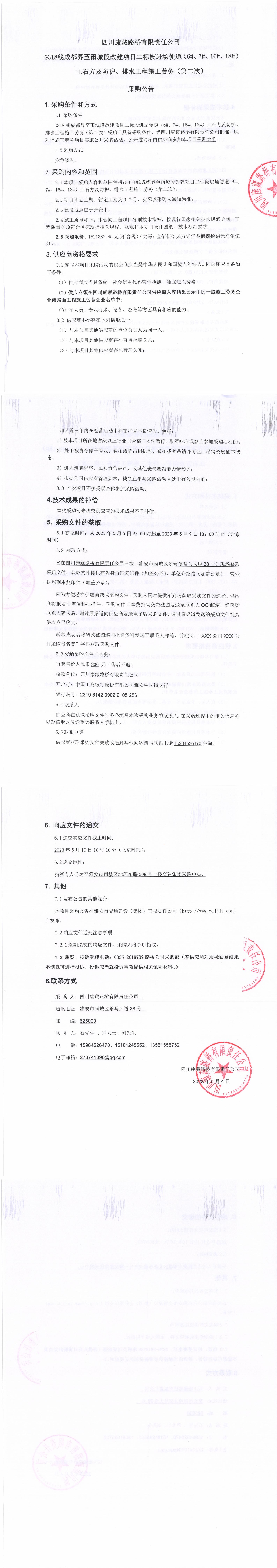 四川康藏路橋有限責(zé)任公司G318線成都至雨城段改建項目二標(biāo)段進(jìn)場便道(6#、7#、16#、18#)土石方及防護(hù)、排水工程施工勞務(wù)(第二次)采購公告