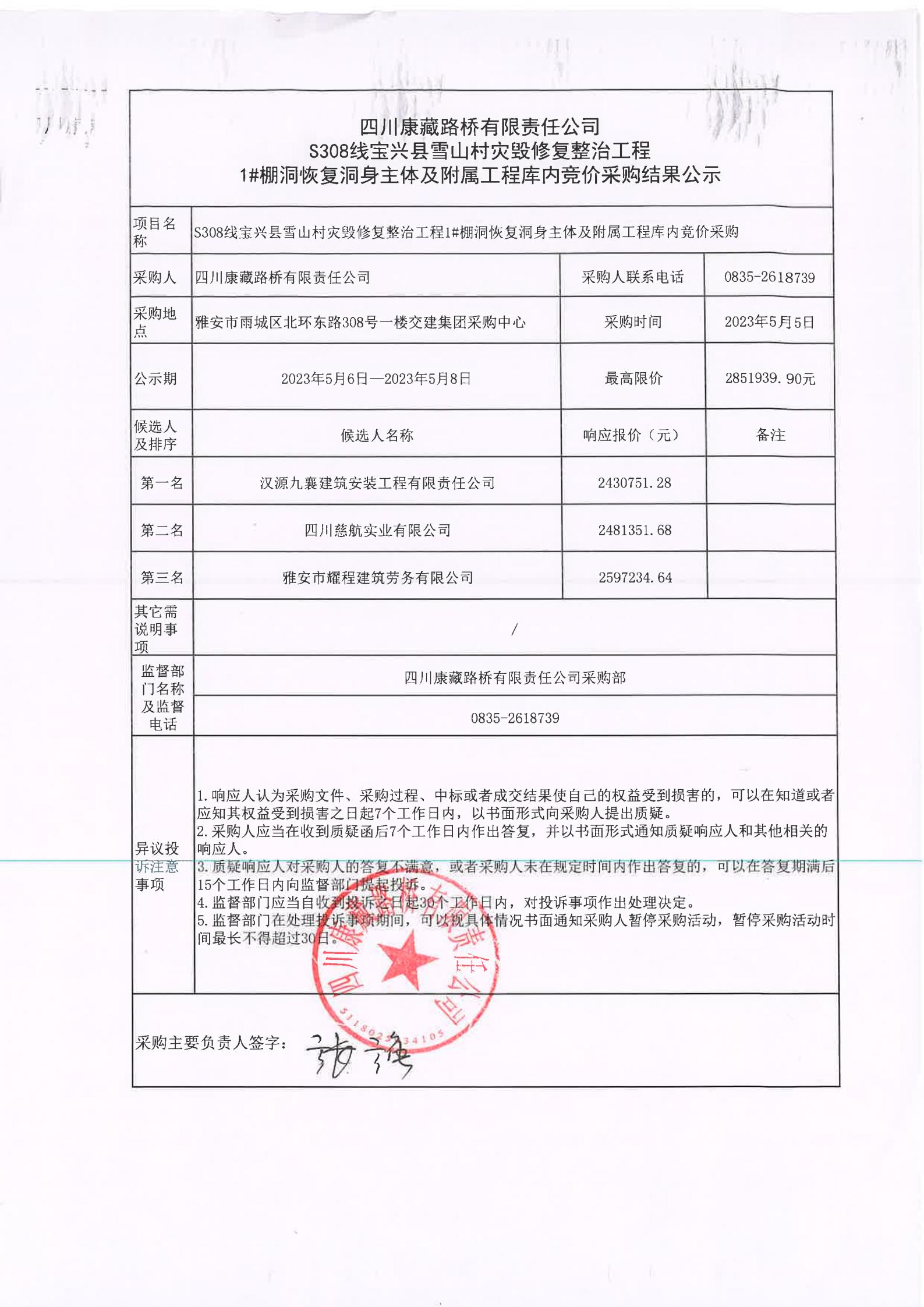 四川康藏路橋有限責任公司S308線寶興縣雪山村災(zāi)毀修復整治工程1#棚洞恢復洞身主體及附屬工程庫內(nèi)競價采購結(jié)果公示