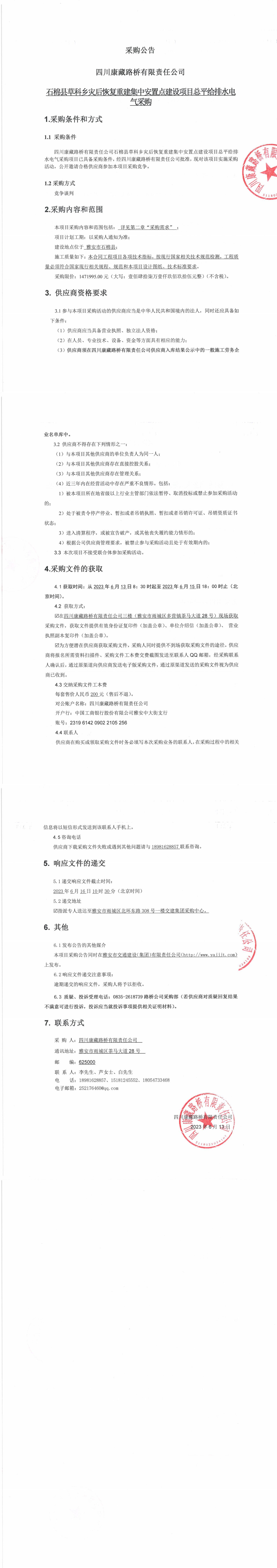 四川康藏路橋有限責(zé)任公司石棉縣草科鄉(xiāng)災(zāi)后恢復(fù)重建集中安置點(diǎn)建設(shè)項(xiàng)目總平給排水電器采購(gòu)公告