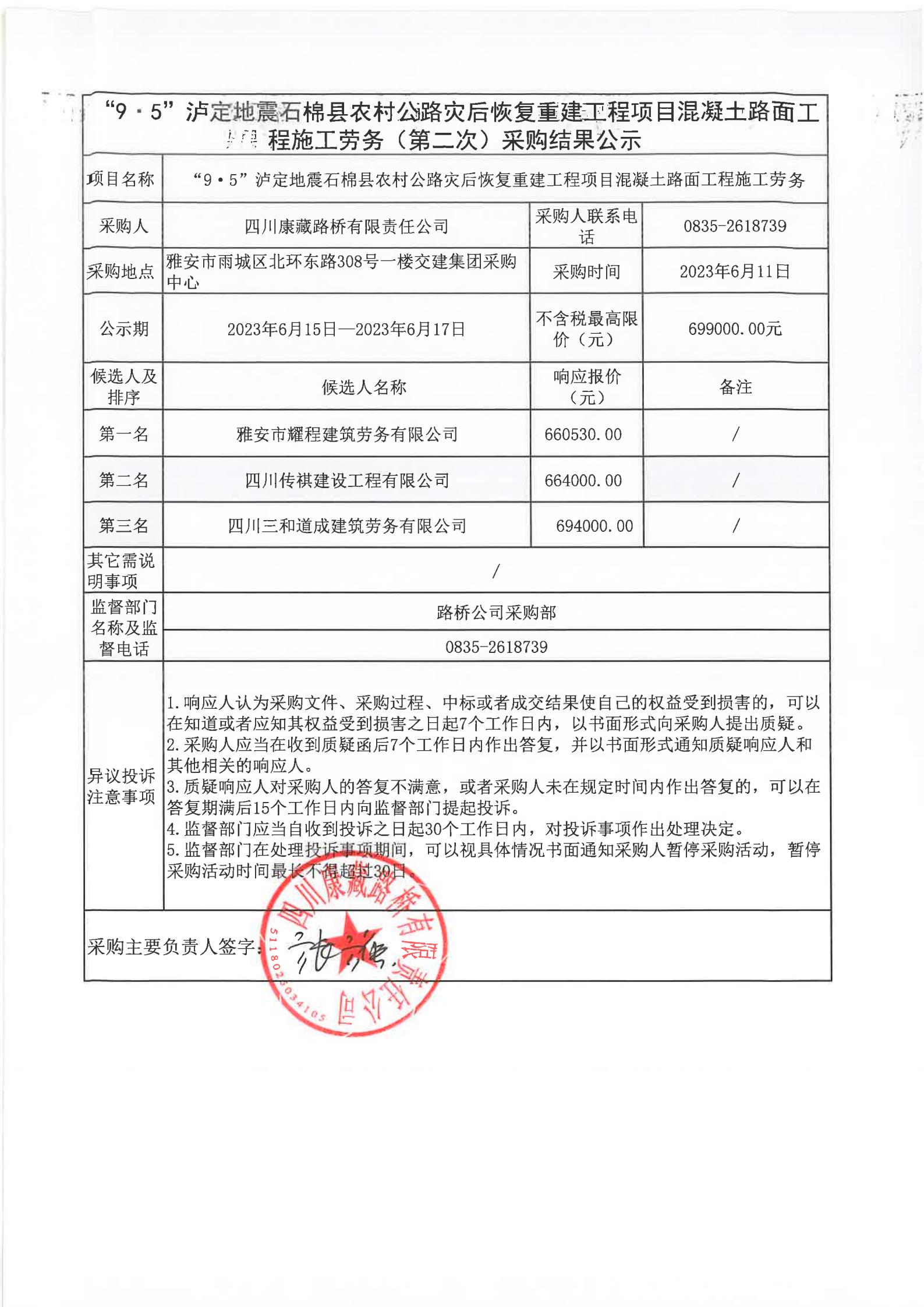 四川康藏路橋有限責任公司“9·5”瀘定地震石棉縣農(nóng)村公路災后恢復重建工程項目混凝土路面工程施工勞務采購(第二次)結(jié)果公示