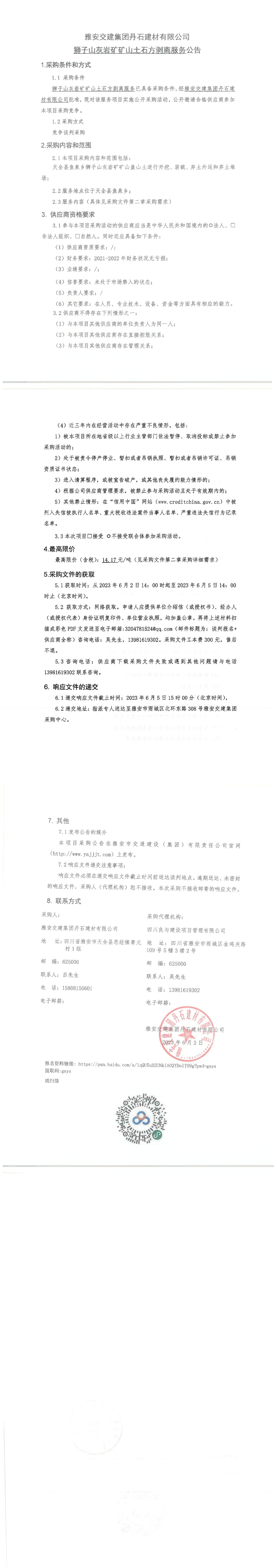 雅安交建集團(tuán)丹石建材有限公司獅子山灰?guī)r礦礦山土石方剝離服務(wù)公告