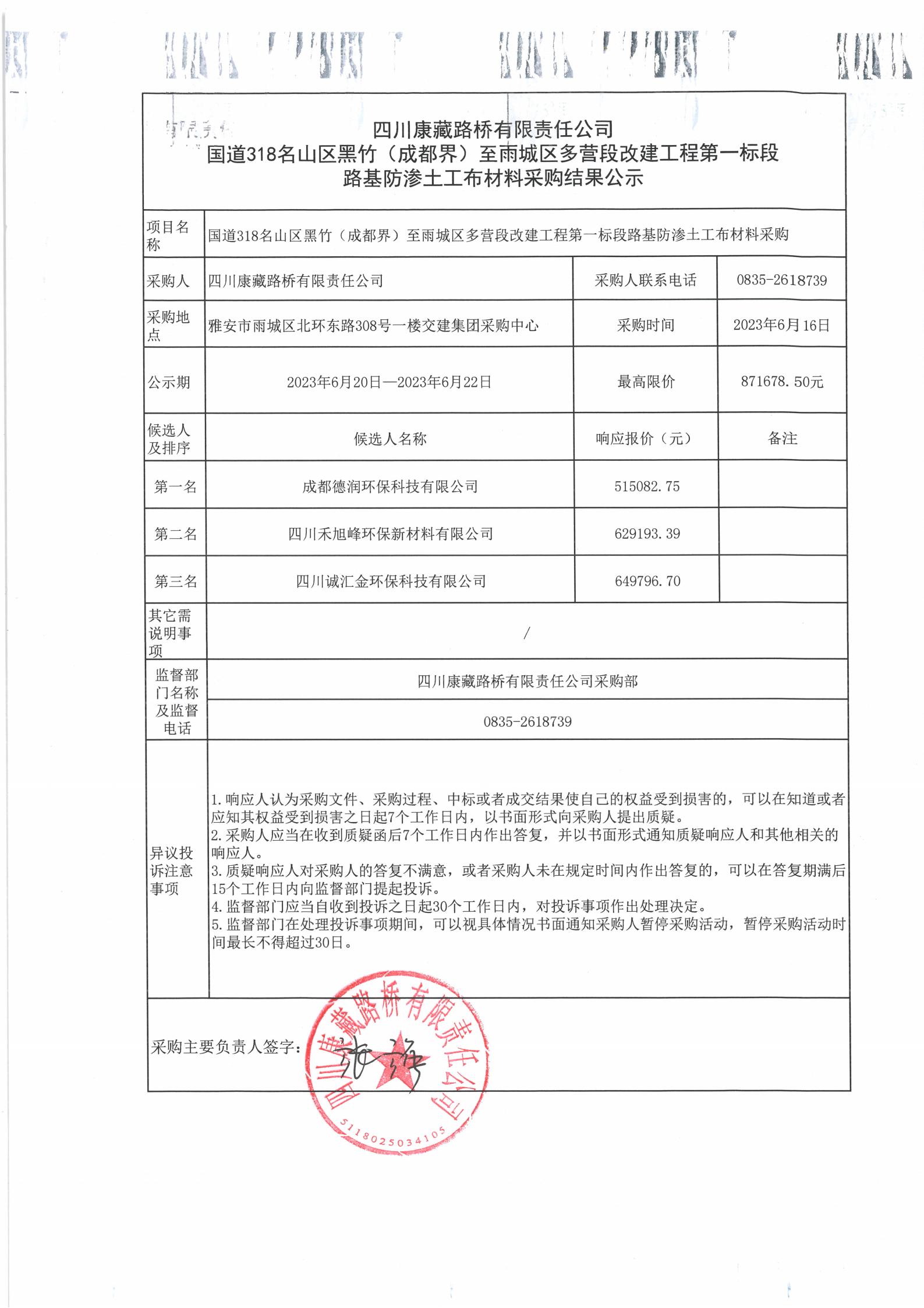 四川康藏路橋有限責任公司國道318名山區(qū)黑竹(成都界)至雨城區(qū)多營段改建工程第一標段路基防滲土工布材料采購結果公示
