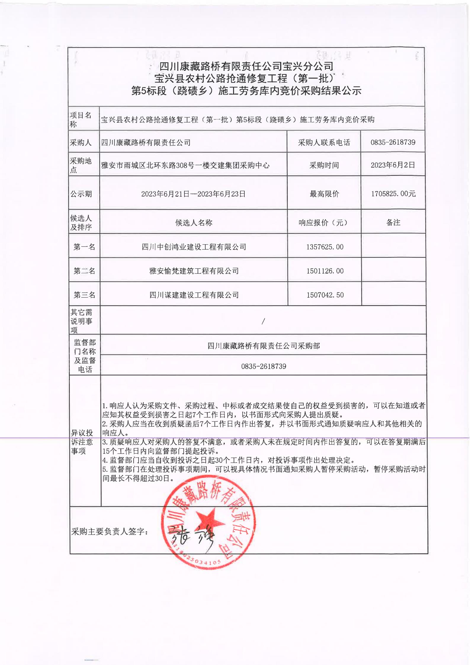 四川康藏路橋有限責(zé)任公司寶興分公司寶興縣農(nóng)村公路搶通修復(fù)工程(第一批)第5標(biāo)段(蹺磧鄉(xiāng))施工勞務(wù)庫內(nèi)競價采購結(jié)果公示