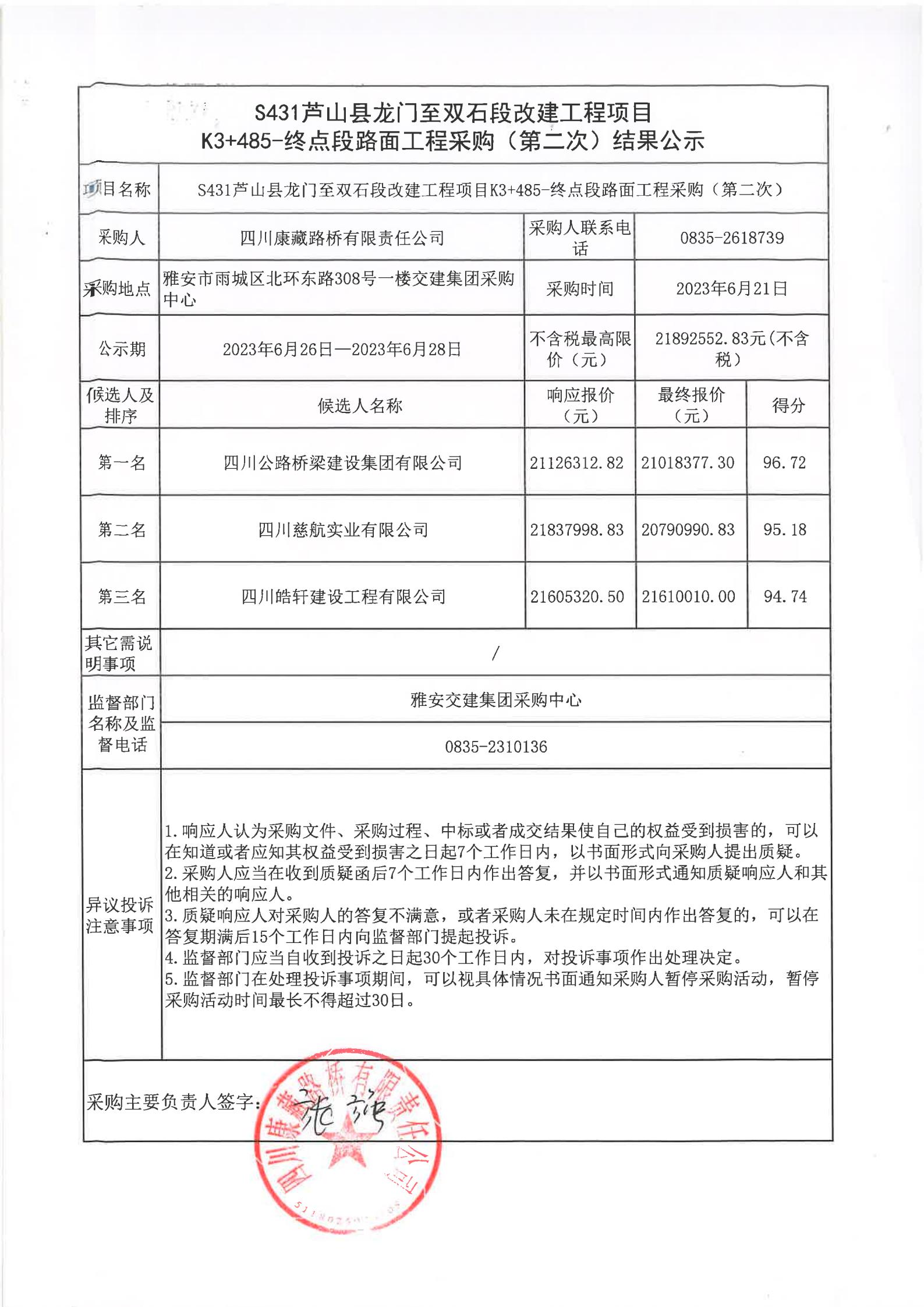 四川康藏路橋有限責(zé)任公司S431蘆山縣龍門至雙石段改建工程項(xiàng)目K3+485-終點(diǎn)段路面工程采購(第二次)結(jié)果公示