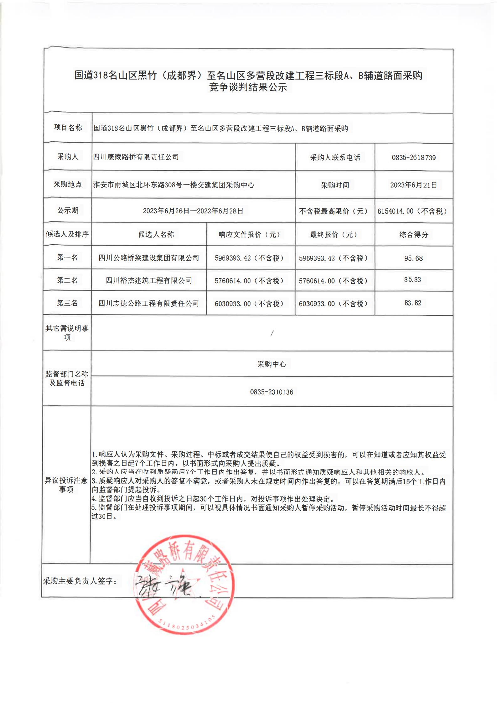 四川康藏路橋有限責(zé)任公司國道318名山區(qū)黑竹(成都界)至雨城區(qū)多營段改建工程三標(biāo)段A、B輔道路面采購競(jìng)爭(zhēng)談判結(jié)果公示