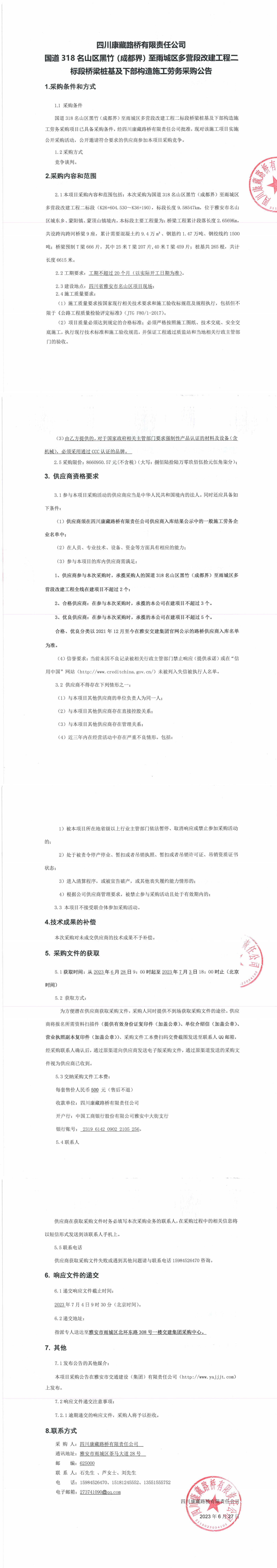 四川康藏路橋有限責(zé)任公司國道318名山區(qū)黑竹(成都界)至雨城區(qū)多營段改建工程二標段橋梁樁基及下部構(gòu)造施工勞務(wù)采購公告