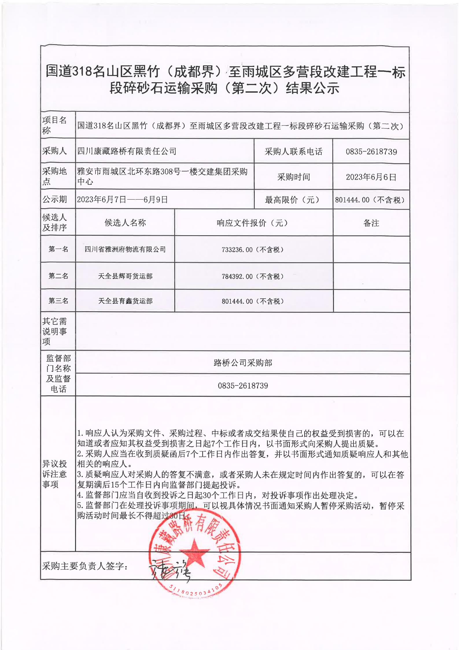 四川康藏路橋有限責(zé)任公司國道318名山區(qū)黑竹(成都界)至雨城區(qū)多營段改建工程一標(biāo)段碎砂石運(yùn)輸采購(第二次)結(jié)果公示