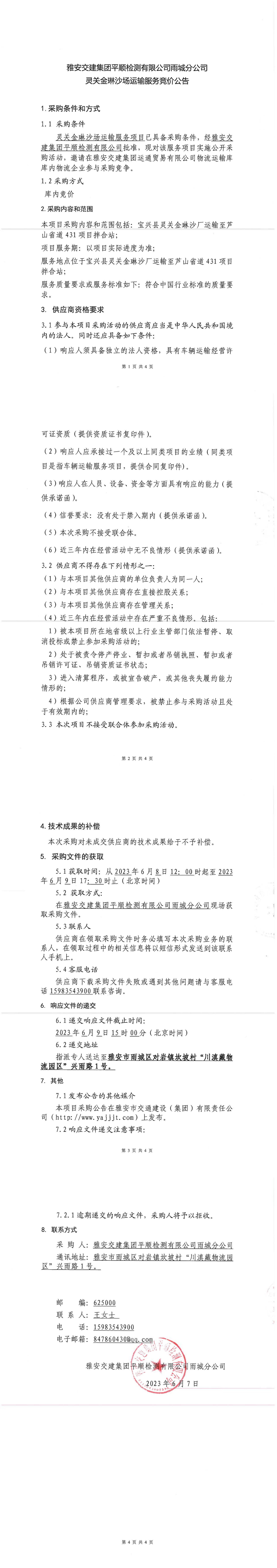 雅安交建集團平順檢測有限公司雨城分公司靈關(guān)金琳沙場運輸服務(wù)競價公告