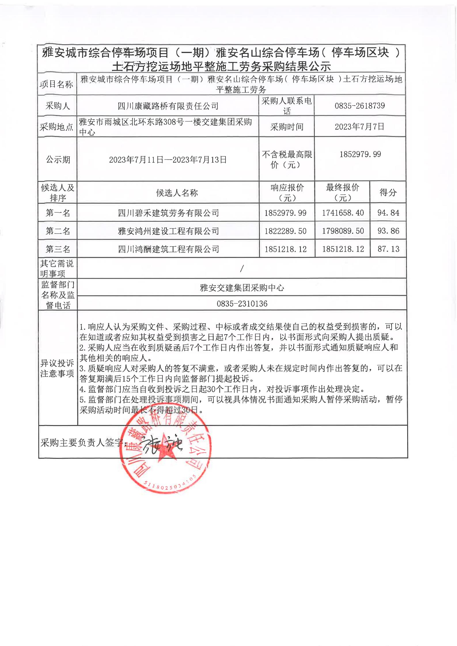 四川康藏路橋有限責任公司雅安城市綜合停車場項目(一期)雅安名山綜合停車場(停車場區(qū)塊)土石方挖運場地平整施工勞務采購結(jié)果公示
