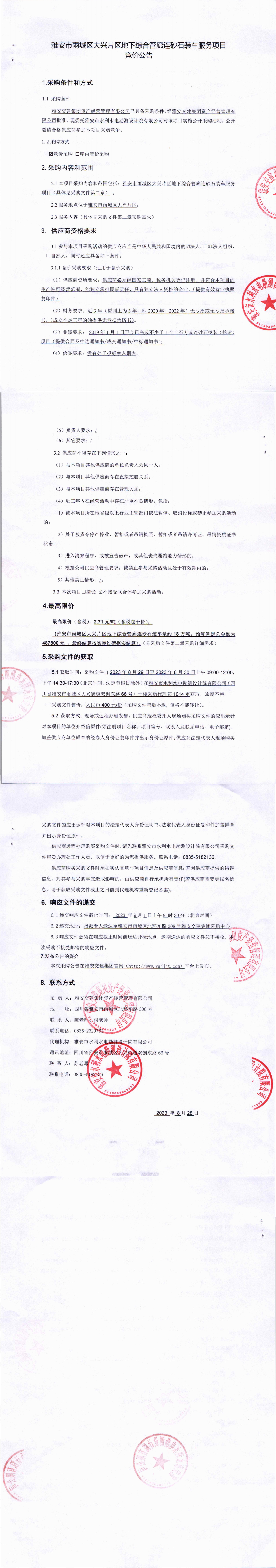 雅安交建集團(tuán)資產(chǎn)經(jīng)營管理有限公司雅安市雨城區(qū)大興片區(qū)地下綜合管廊連砂石裝車服務(wù)項目競價公告