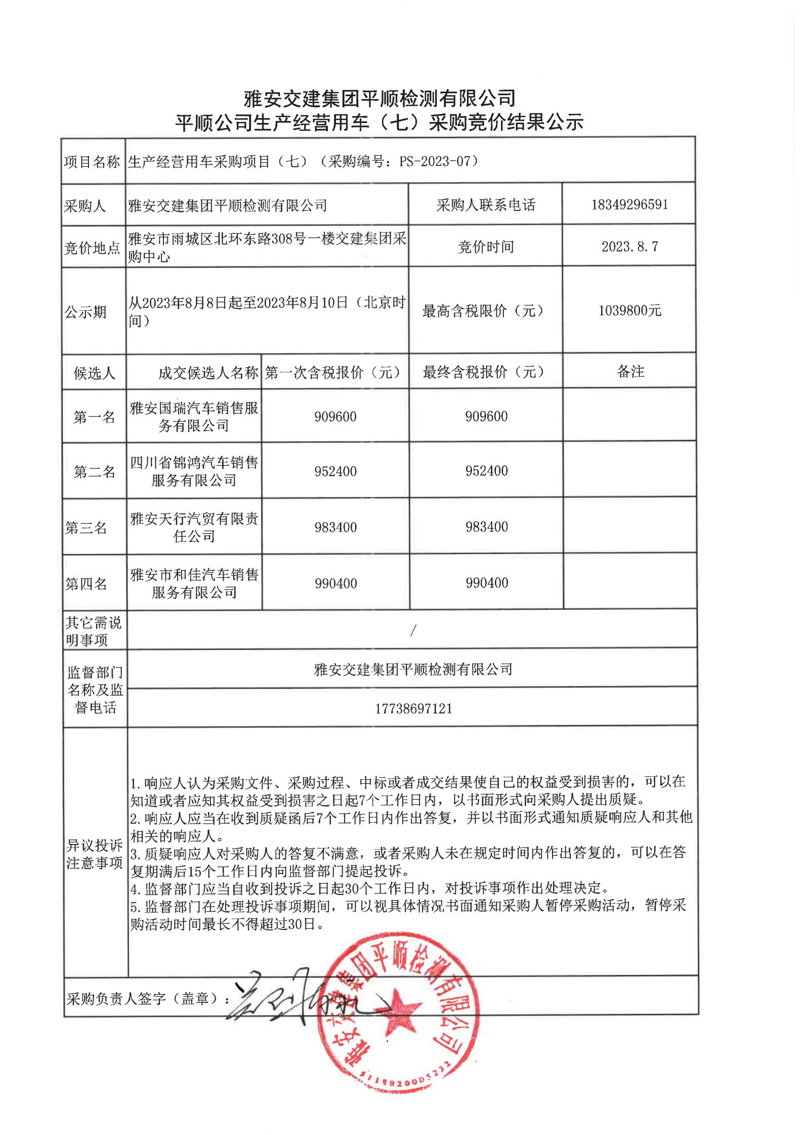 雅安交建集團平順檢測有限公司平順公司生產(chǎn)經(jīng)營用車(七)采購競價結果公示