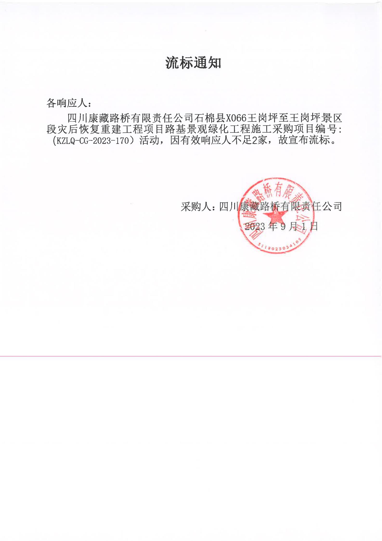 四川康藏路橋有限責(zé)任公司石棉縣X066王崗坪至王崗坪景區(qū)段災(zāi)后恢復(fù)重建工程項目路基景觀綠化工程施工采購流標通知