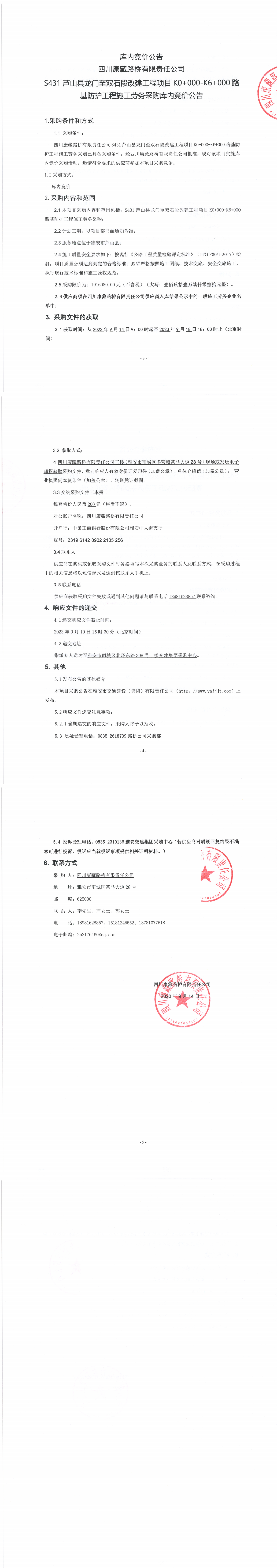 四川康藏路橋有限責(zé)任公司S431蘆山縣龍門至雙石段改建工程項(xiàng)目K0+000-K6+000路基防護(hù)工程施工勞務(wù)采購公告