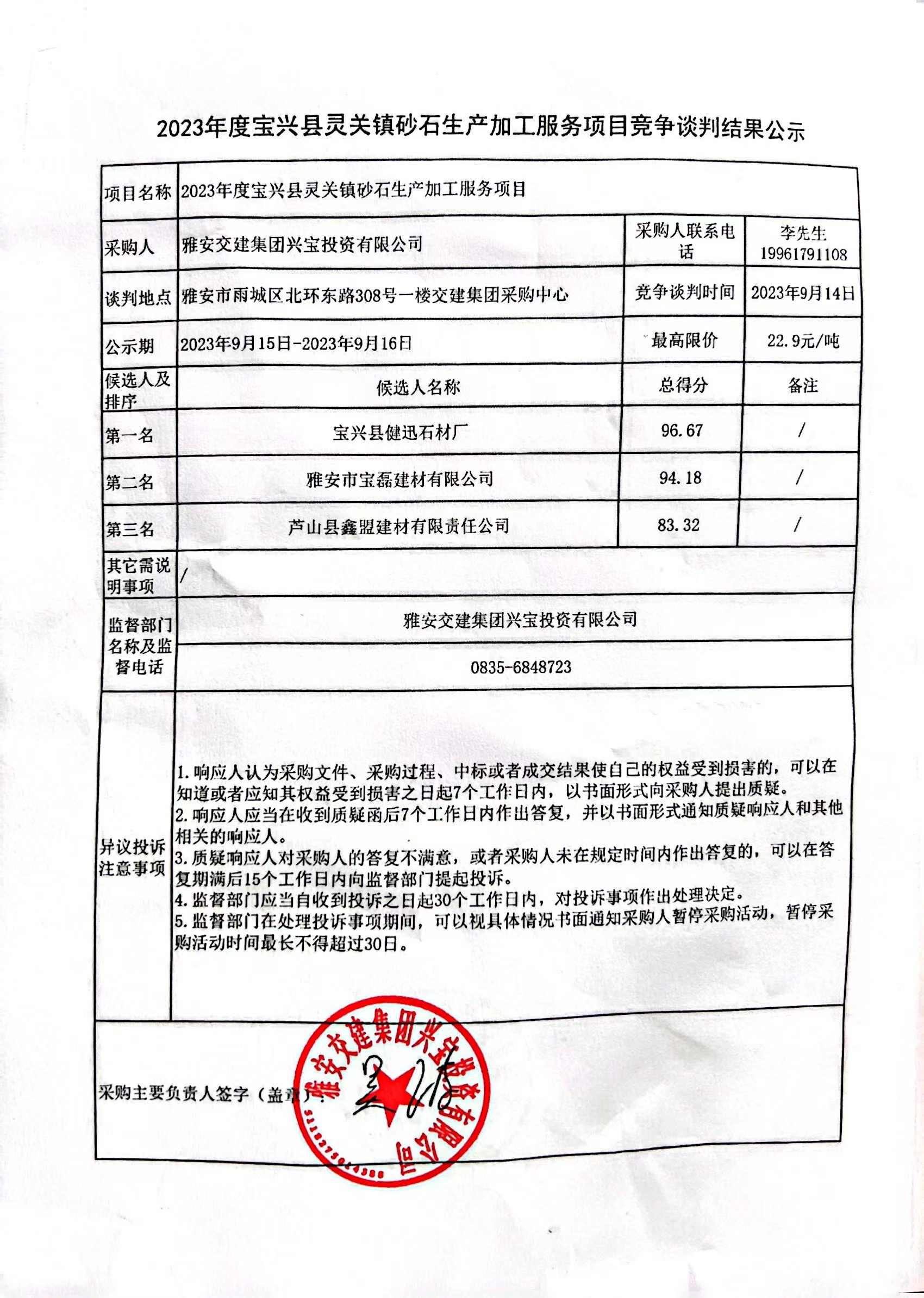 雅安交建集團興寶投資有限公司2023年度寶興縣靈關(guān)鎮(zhèn)砂石生產(chǎn)加工服務項目競爭談判結(jié)果公示