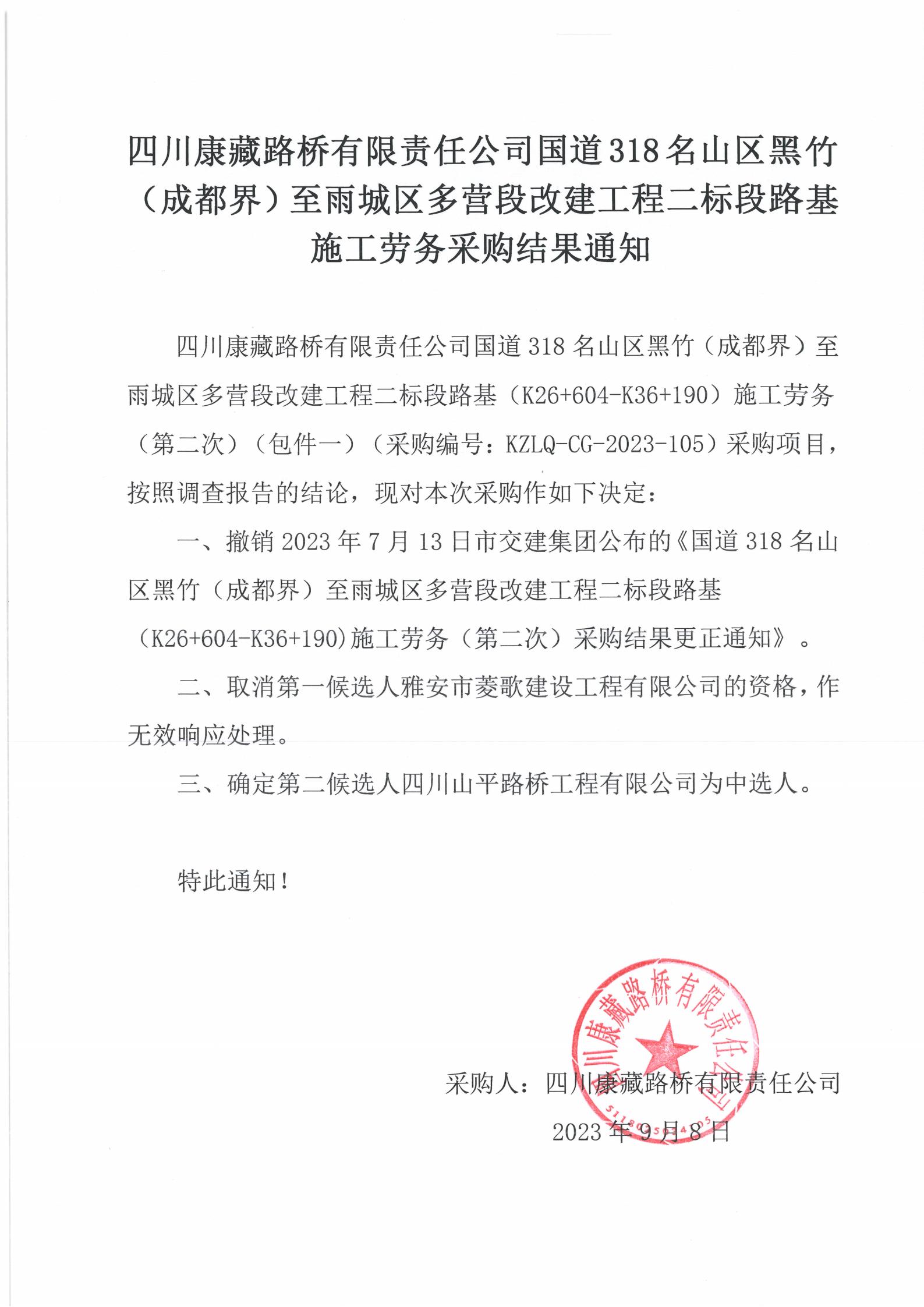 四川康藏路橋有限責(zé)任公司國(guó)道318名山區(qū)黑竹(成都界)至雨城區(qū)多營(yíng)段改建工程二標(biāo)段路基施工勞務(wù)采購(gòu)結(jié)果通知