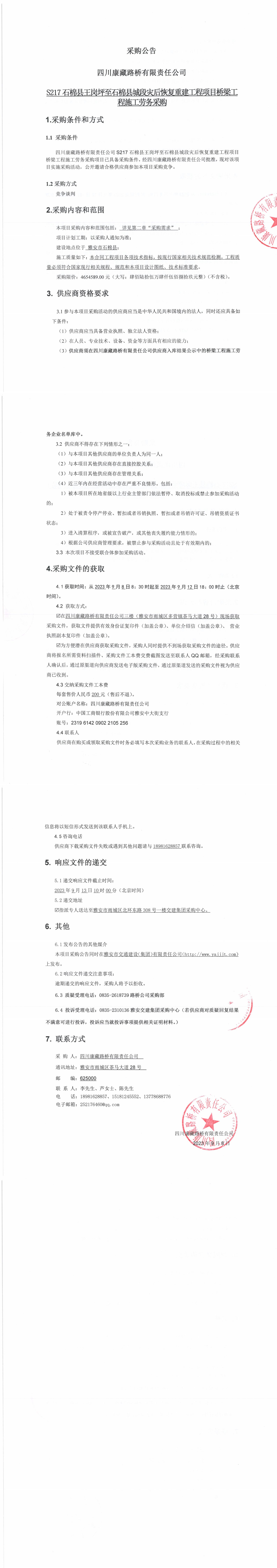 四川康藏路橋有限責任公司S217石棉縣王崗坪至石棉縣城段災后恢復重建工程項目橋梁工程施工勞務采購公告
