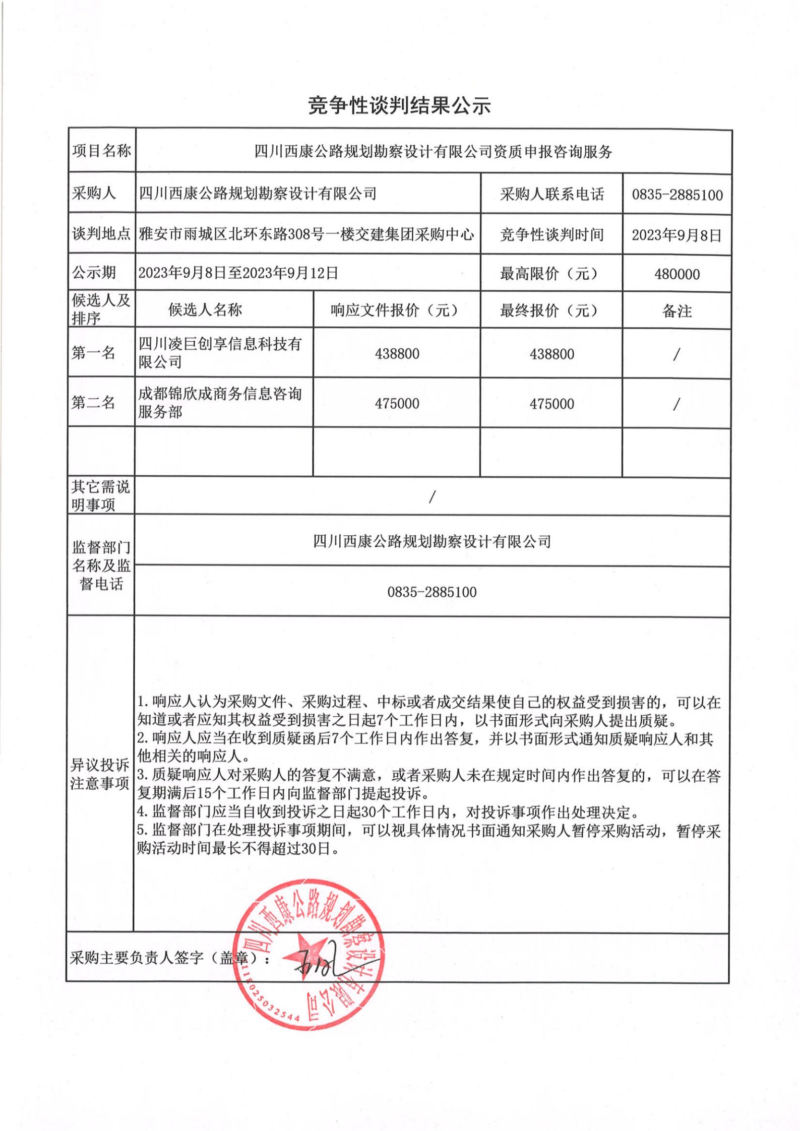 四川西康公路規(guī)劃勘察設(shè)計(jì)有限公司資質(zhì)申報(bào)咨詢服務(wù)競爭談判結(jié)果公示
