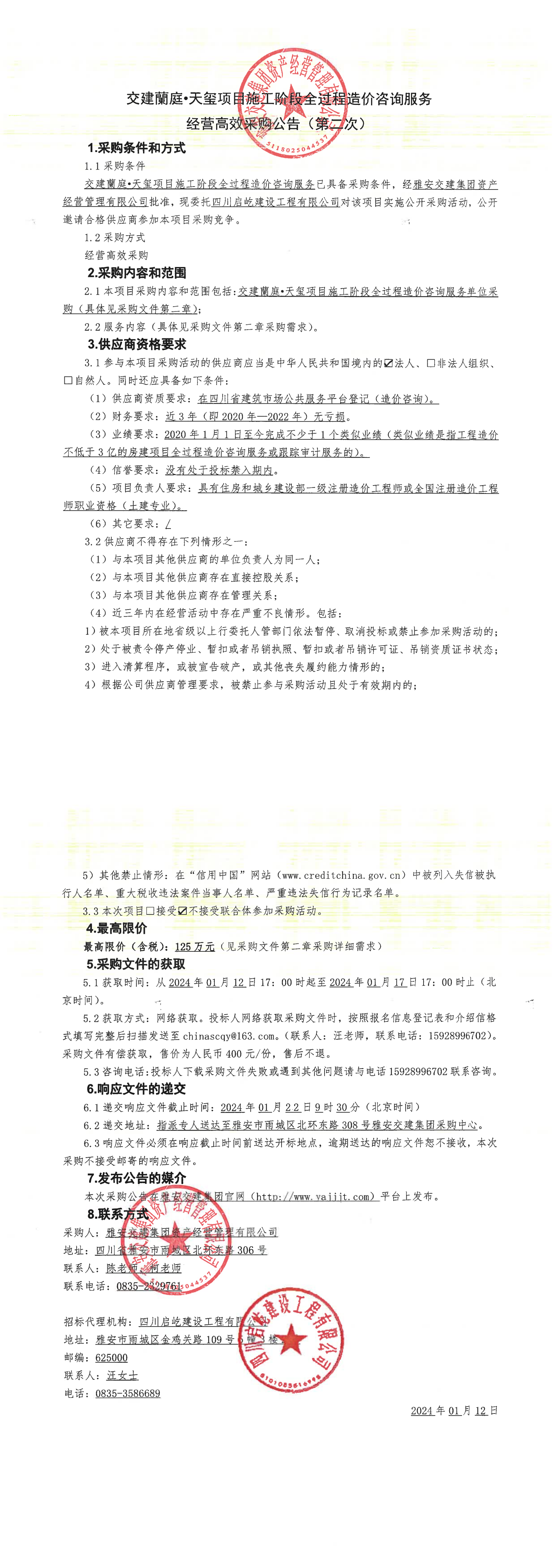 雅安交建集團(tuán)資產(chǎn)經(jīng)營(yíng)管理有限公司交建蘭庭·天璽項(xiàng)目施工階段全過(guò)程造價(jià)咨詢(xún)服務(wù)經(jīng)營(yíng)高效采購(gòu)公告(第二次)