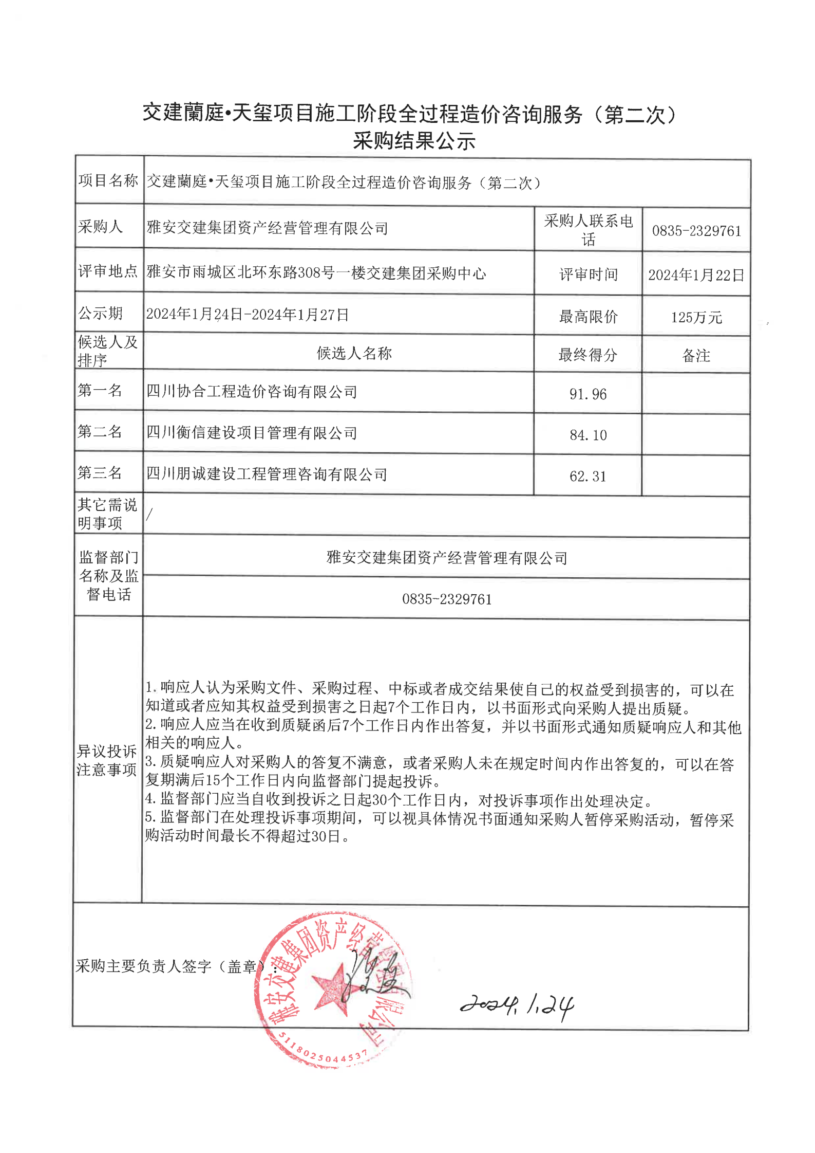 雅安交建集團資產經(jīng)營管理有限公司交建蘭庭·天璽項目施工階段全過程造價咨詢服務(第二次)采購結果公示