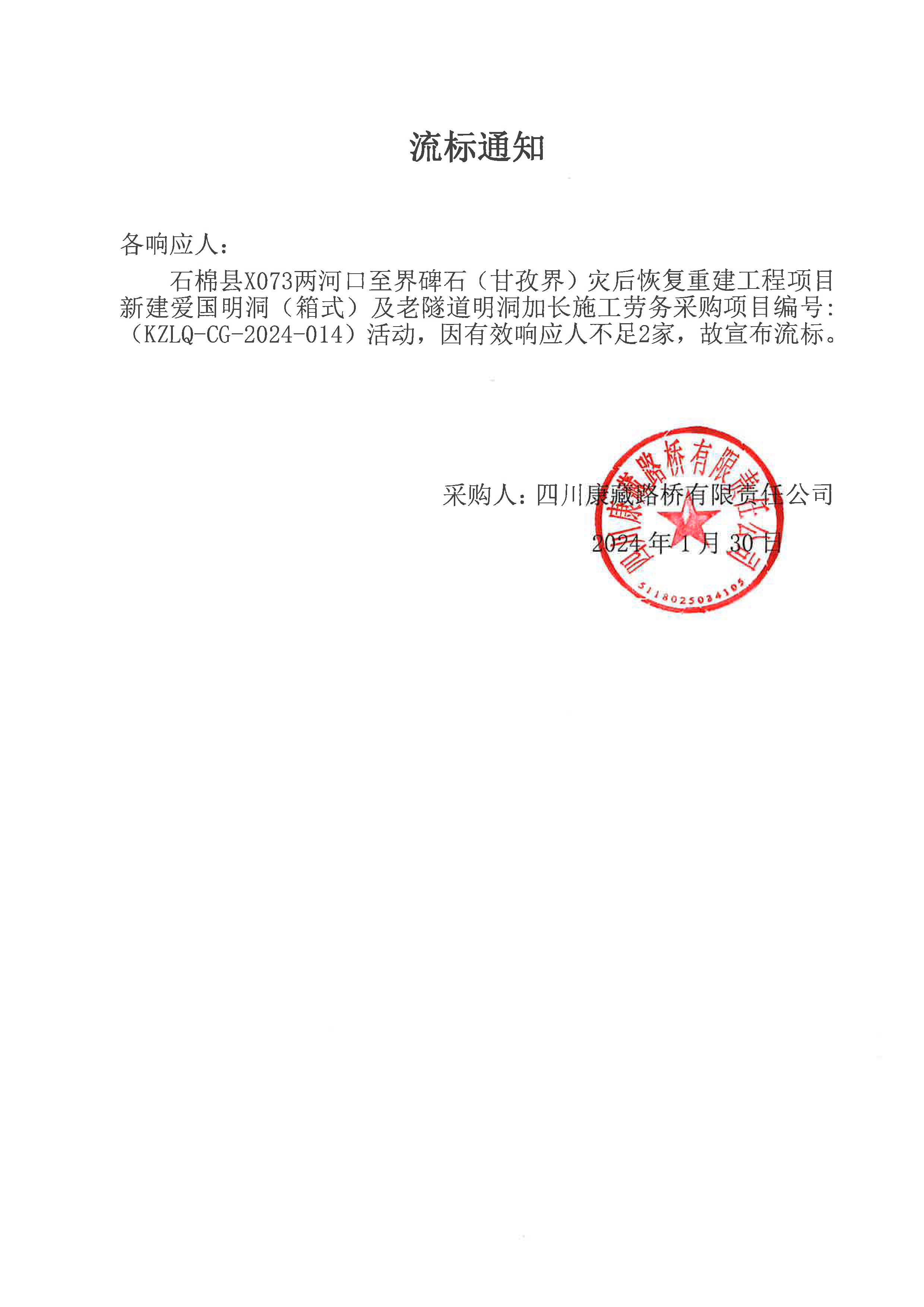 四川康藏路橋有限責(zé)任公司石棉縣X073兩河口至界碑石 (甘孜界)災(zāi)后恢復(fù)重建工程項(xiàng)目新建愛國明洞(箱式)及老隧道明洞加長施工勞務(wù)流標(biāo)通知