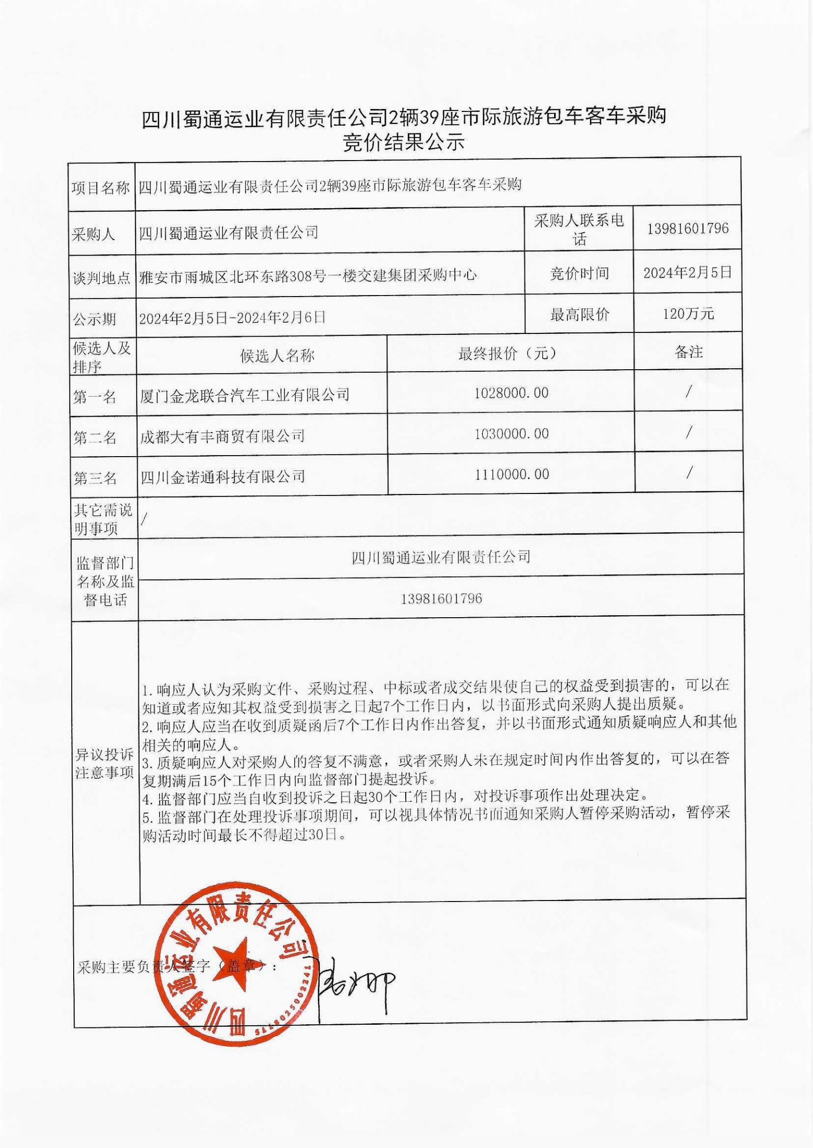 四川蜀通運業(yè)有限責任公司2輛39座市際旅游包車客車采購競價結果公示