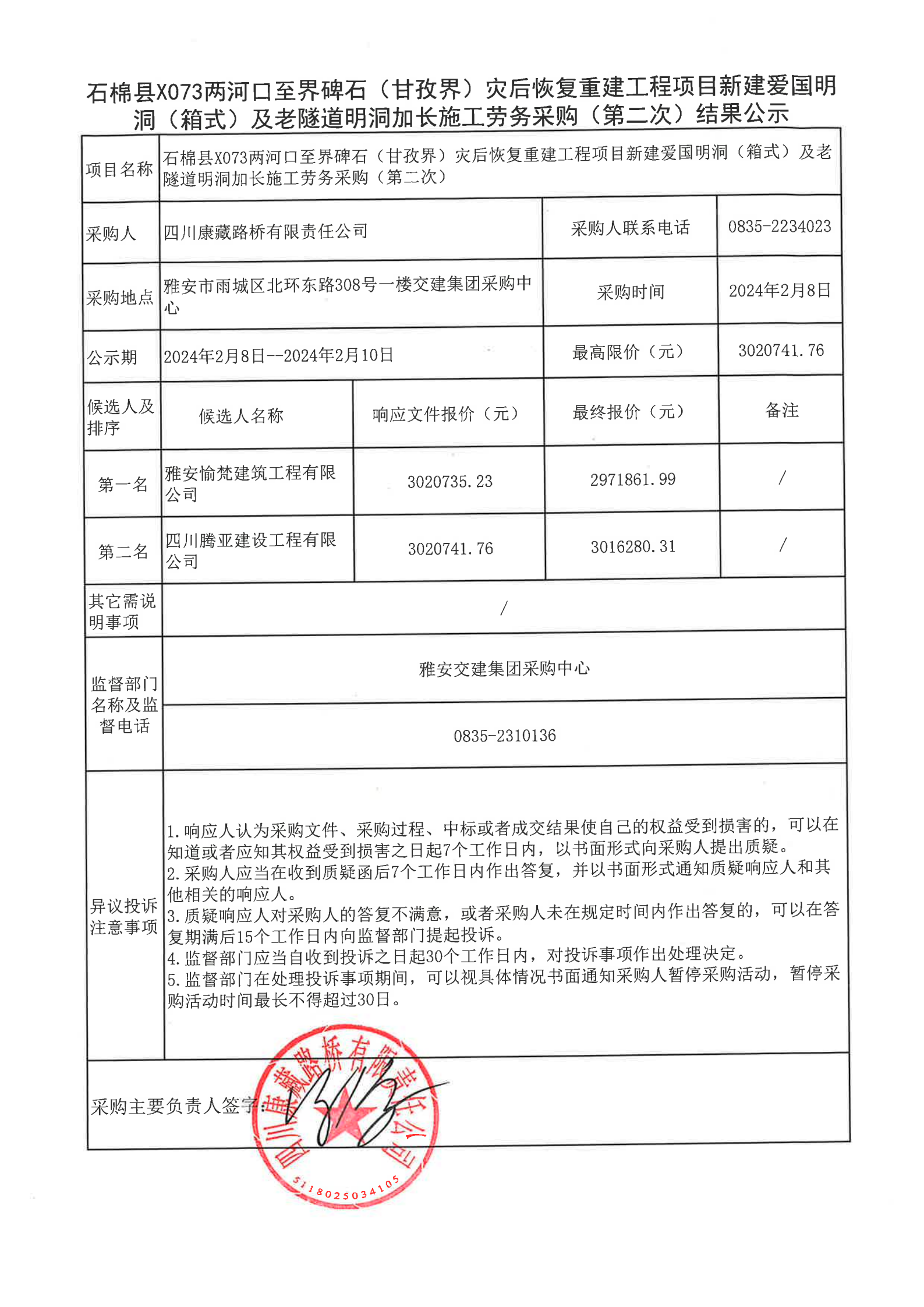 四川康藏路橋有限責任公司石棉縣X073兩河口至界碑石(甘孜界)災后恢復重建工程項目新建愛國明洞(箱式)及老隧道明洞加長施工勞務采購(第二次)結(jié)果公示