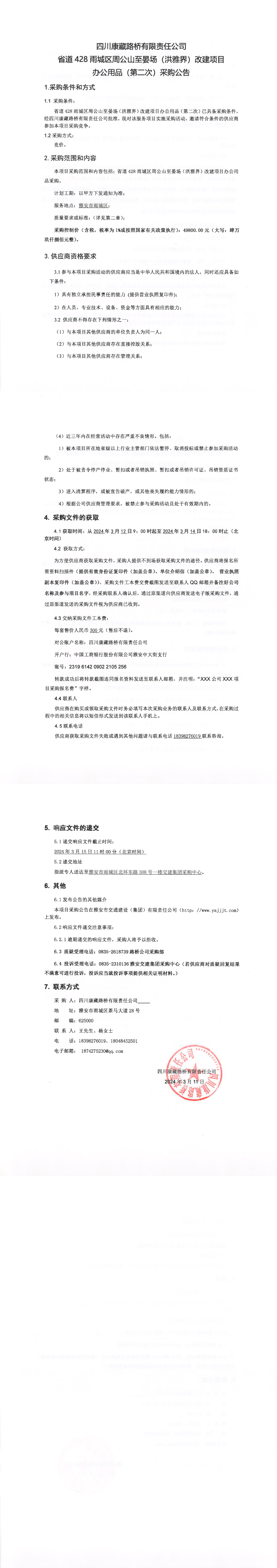 四川康藏路橋有限責(zé)任公司省道428雨城區(qū)周公山至晏場(chǎng)(洪雅界)改建項(xiàng)目辦公用品(第二次)采購(gòu)公告