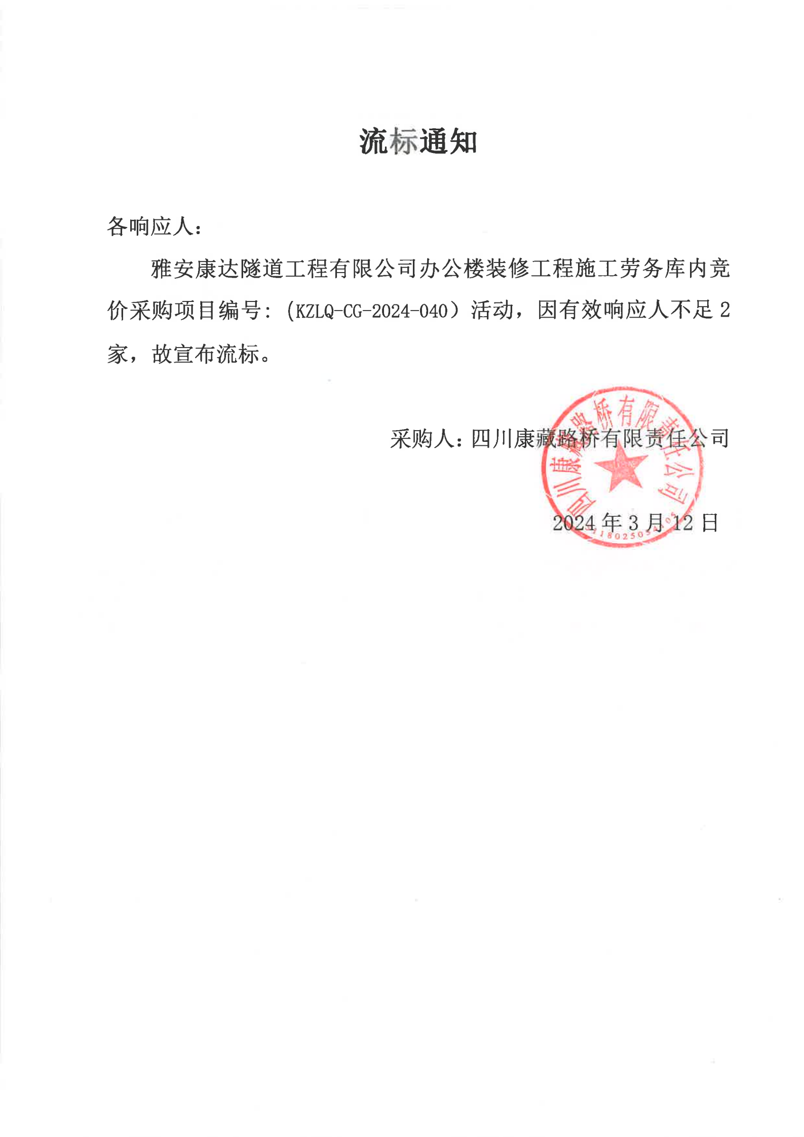 雅安康達(dá)隧道工程有限公司辦公樓裝修工程施工勞務(wù)庫內(nèi)競價(jià)采購流標(biāo)通知