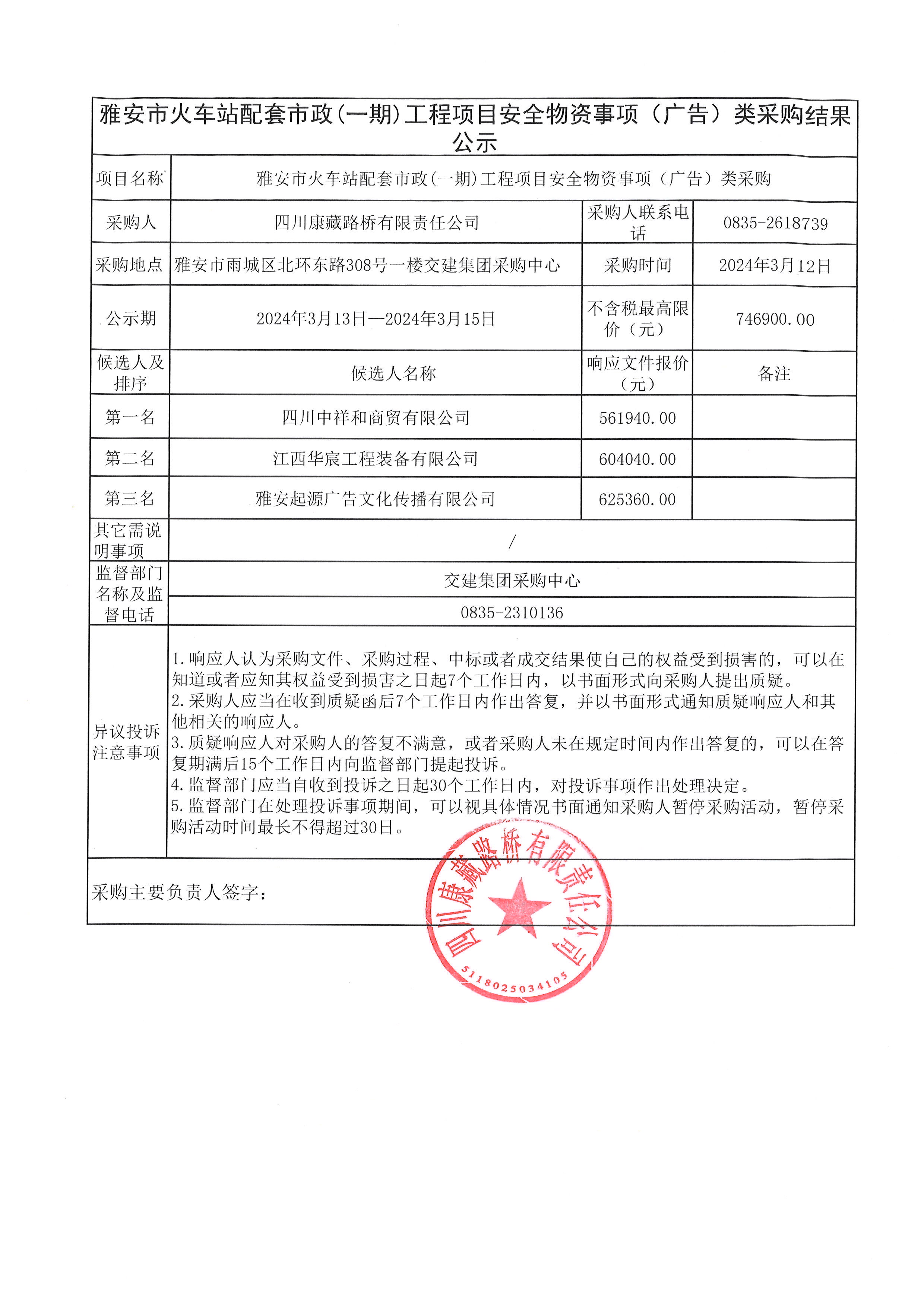 四川康藏路橋有限責(zé)任公司雅安市火車(chē)站配套市政(一期)工程項(xiàng)目安全物資(廣告)采購(gòu)結(jié)果公示