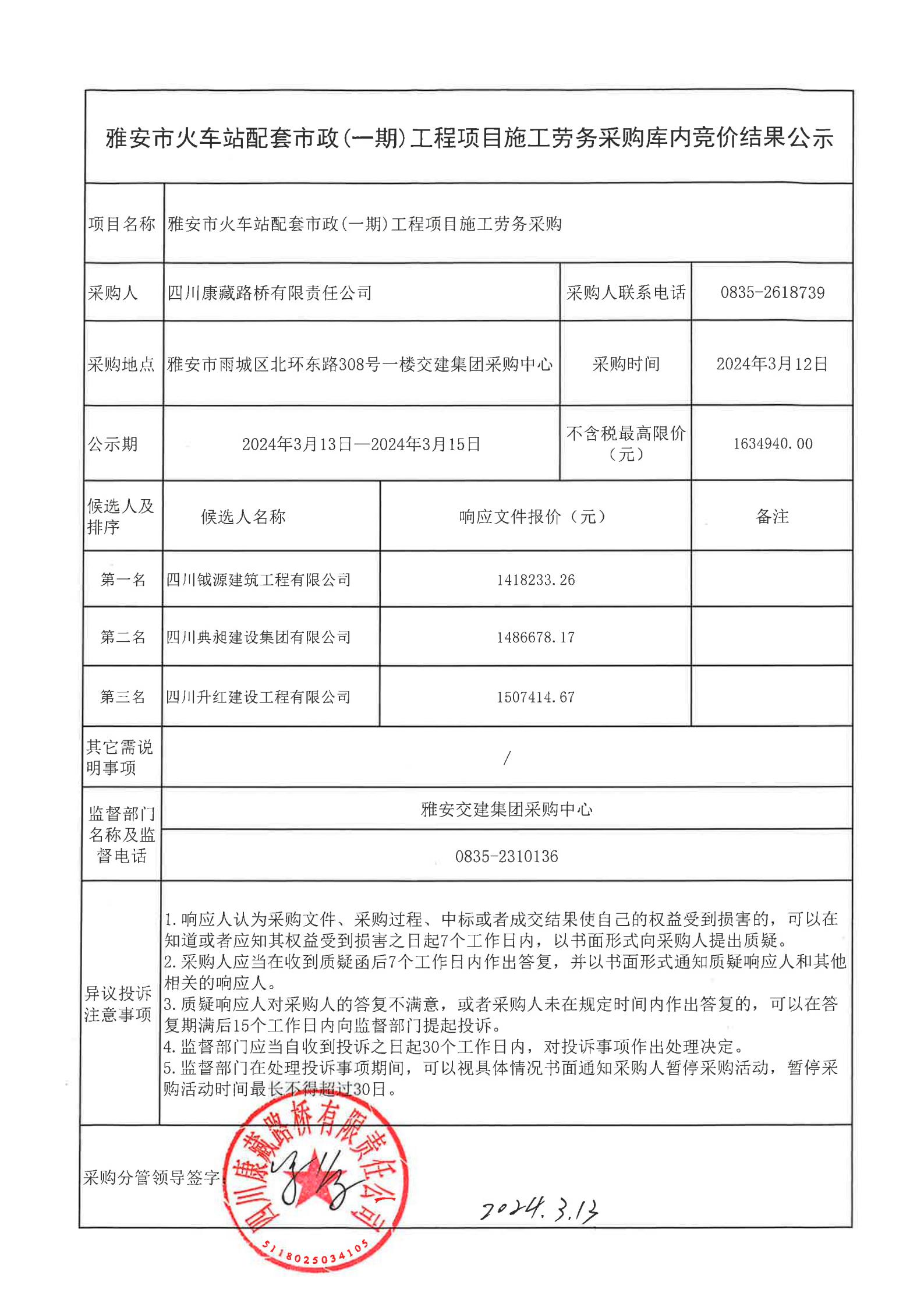 四川康藏路橋有限責(zé)任公司雅安市火車站配套市政(一期)工程項目施工勞務(wù)采購結(jié)果公示
