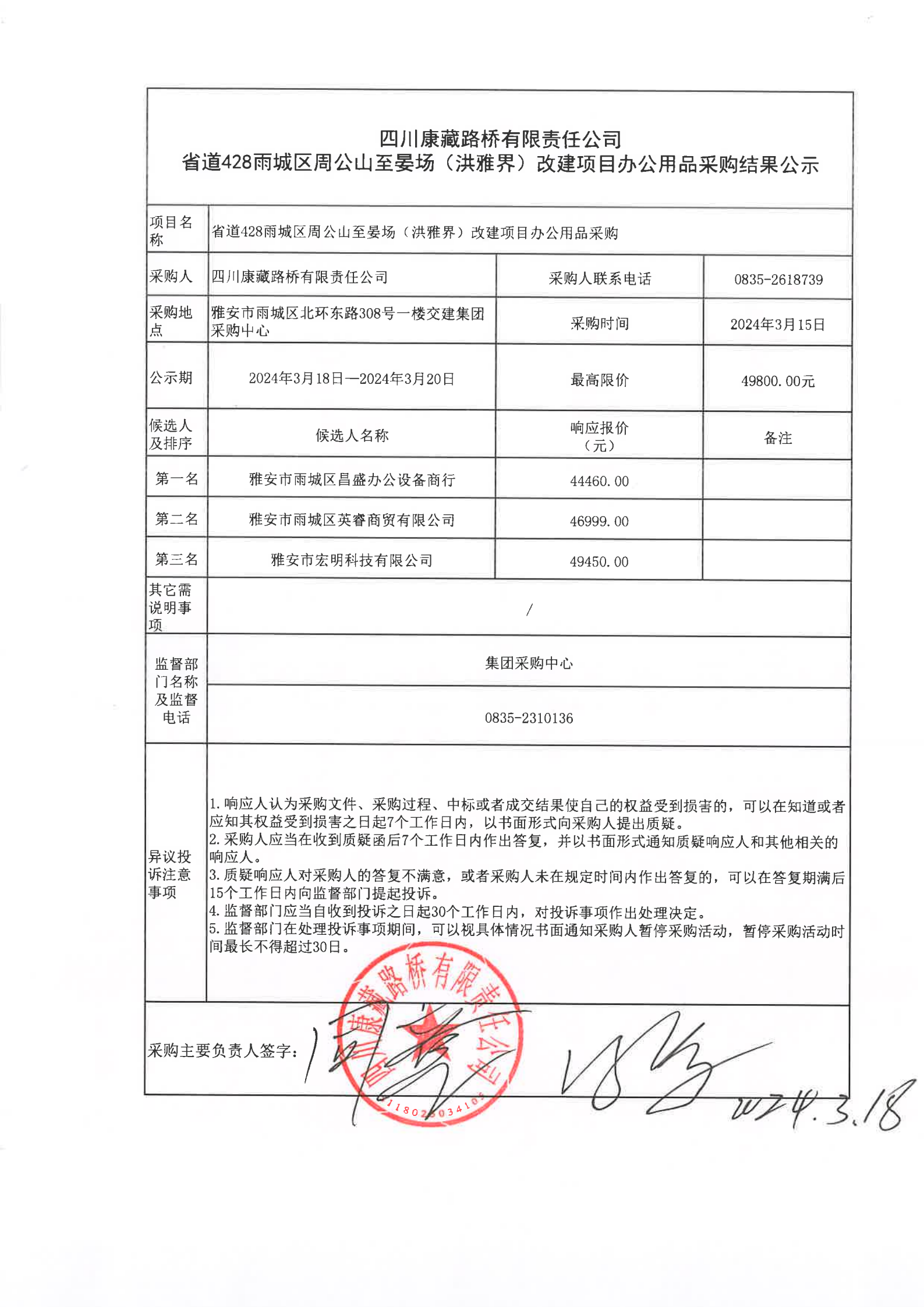 四川康藏路橋有限責任公司省道428雨城區(qū)周公山至晏場(洪雅界)改建項目辦公用品(第二次)采購結果公示