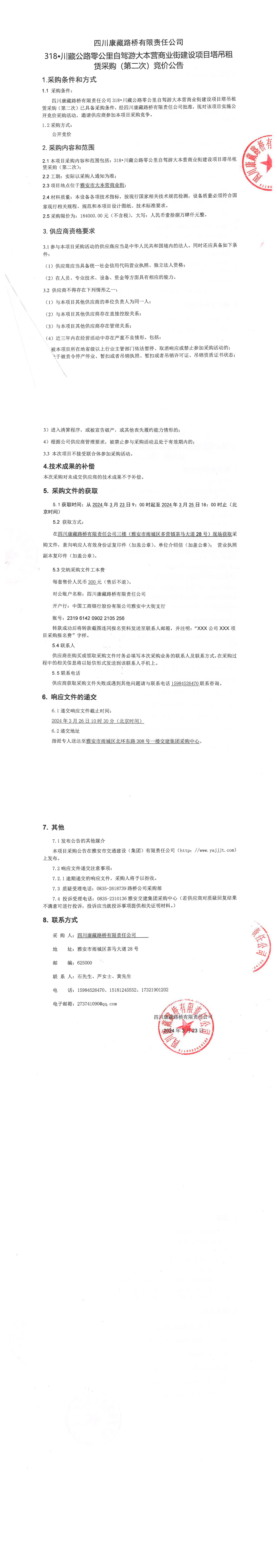 四川康藏路橋有限責任公司318•川藏公路零公里自駕游大本營商業(yè)街建設項目塔吊租賃采購(第二次)競價公告